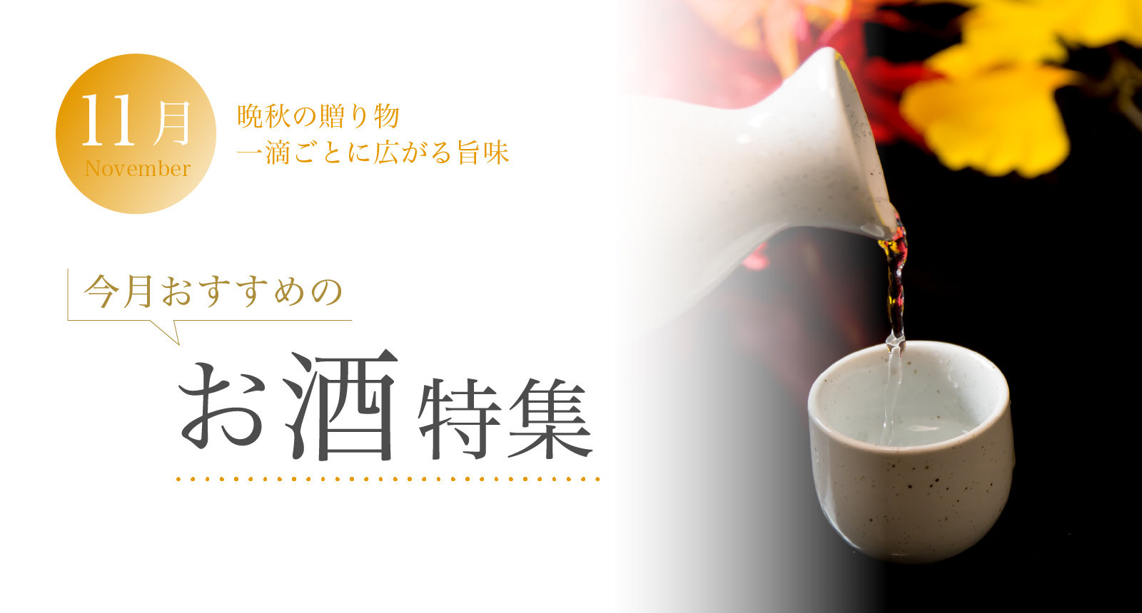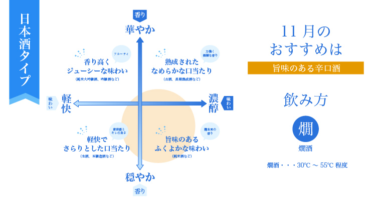 秋が深まり、冷え込みが増す11月には、燗にした辛口の日本酒をくいっと一杯。